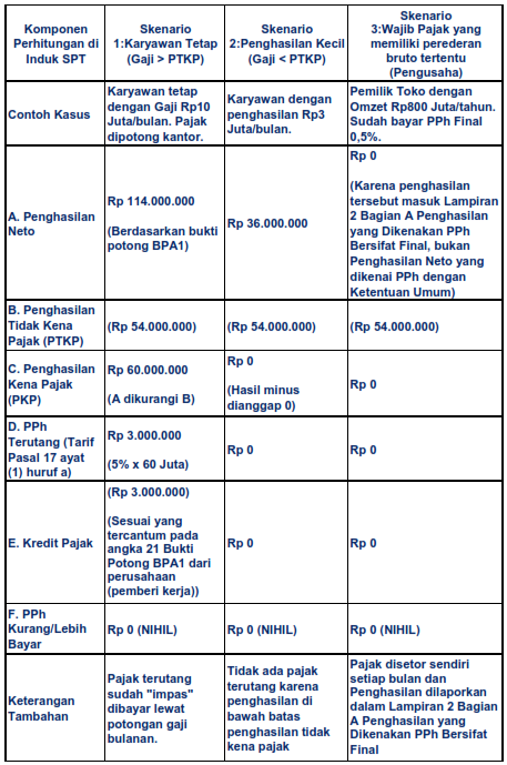 Lampiran berikut adalah tabel perbandingan perhitungan pada Induk SPT Tahunan untuk ketiga skenario tersebut.
